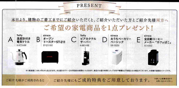 ★ご紹介→御成約→御着工された場合、以下の特典有↓ 代替品の場合有